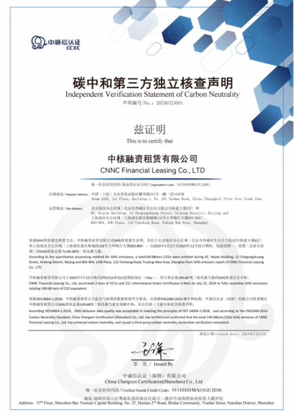 近日,中核融資租賃有限公司獲權(quán)威第三方機(jī)構(gòu)中誠(chéng)信認(rèn)證頒發(fā)碳中和認(rèn)證,成為首家實(shí)現(xiàn)運(yùn)營(yíng)碳中和的融資租賃公司。