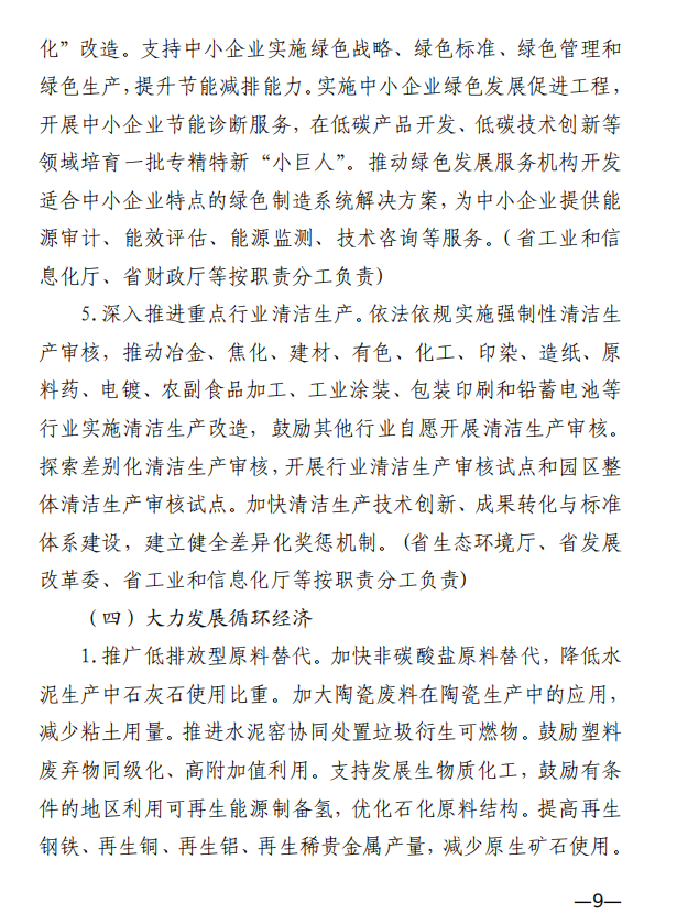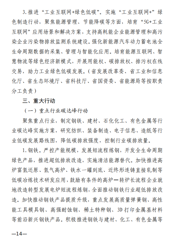 10月10日,江西省工業(yè)和信息化廳、江西省發(fā)展和改革委員會(huì)和江西省生態(tài)環(huán)境廳發(fā)布《關(guān)于印發(fā)江西省工業(yè)領(lǐng)域碳達(dá)峰實(shí)施方案的通知》,《江西省工業(yè)領(lǐng)域碳達(dá)峰實(shí)施方案》提出,“十四五”期間,江西力爭產(chǎn)業(yè)結(jié)構(gòu)與用能結(jié)構(gòu)優(yōu)化取得積極進(jìn)展,能源資源利用效率明顯提升,綠色工廠和綠色園區(qū)分別達(dá)到200家和50家;到2025年,全省規(guī)模以上工業(yè)單位增加值能耗較2020年下降12%以上?!笆逦濉逼陂g,力爭一批重點(diǎn)產(chǎn)品工藝能效達(dá)到國內(nèi)領(lǐng)先水平,基本建立以高效、綠色、循環(huán)、低碳為特征的現(xiàn)代工業(yè)體系;確保工業(yè)領(lǐng)域二氧化碳排放在2030年前達(dá)峰。