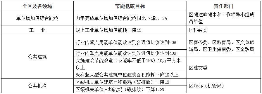 2. 開展碳達峰碳中和及節(jié)能目標責任評價。將“雙碳”工作相關(guān)指標納入各管理局(管委會)、各鎮(zhèn)經(jīng)濟社會發(fā)展綜合評價體系,進一步完善評價指標體系和評價考核制度,落實目標分解、考核評價和結(jié)果應用。(責任部門:區(qū)發(fā)改委)