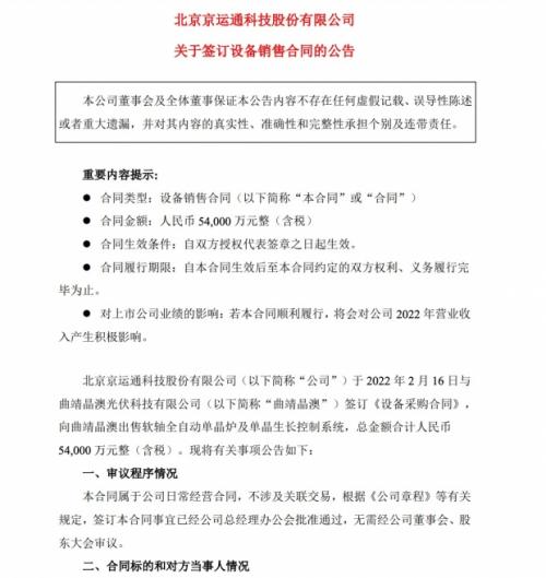 2月17日,京運(yùn)通(601908.SH)公告稱(chēng),公司于2022年2月16日與曲靖晶澳簽訂《設(shè)備采購(gòu)合同》,向曲靖晶澳出售軟軸全自動(dòng)單晶爐及單晶生長(zhǎng)控制系統(tǒng),總金額合計(jì)5.4億元(含稅)。