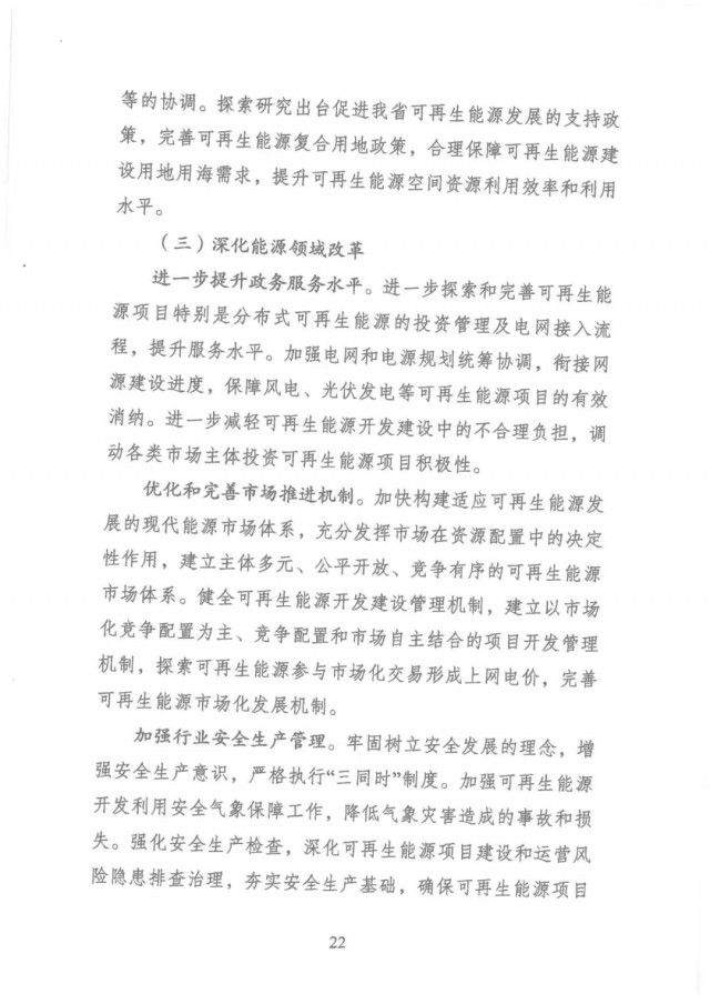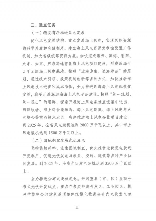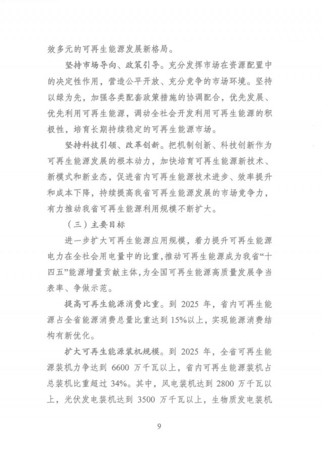 ● 擴(kuò)大可再生能源裝機(jī)規(guī)模:到2025年,全省可再生能源裝機(jī)力爭(zhēng)達(dá)到6600萬(wàn)千瓦以上,省內(nèi)可再生能源裝機(jī)占總裝機(jī)比重超過(guò)34%。其中,風(fēng)電裝機(jī)達(dá)到2800萬(wàn)千瓦以 上,光伏發(fā)電裝機(jī)達(dá)到 3500 萬(wàn)千瓦以上,生物質(zhì)發(fā)電裝機(jī)達(dá)到300萬(wàn)千瓦以上,另外,抽水蓄能裝機(jī)達(dá)到328萬(wàn)千瓦 以上,實(shí)現(xiàn)電力裝機(jī)結(jié)構(gòu)有新跨越。