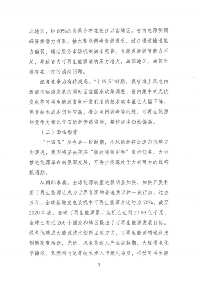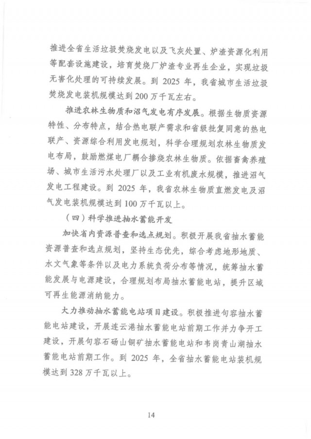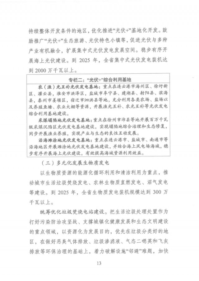 “十四五”期間,江蘇將穩(wěn)妥有序推進(jìn)風(fēng)電發(fā)展,優(yōu)化風(fēng)電發(fā)展結(jié)構(gòu),重點(diǎn)發(fā)展海上風(fēng)電,因地制宜發(fā)展光伏發(fā)電,全力推進(jìn)分布式光伏發(fā)電,穩(wěn)步有序開(kāi)展海上光伏建設(shè),加快推進(jìn)“光伏+”綜合利用,多元化發(fā)展生物質(zhì)發(fā)電,科學(xué)推進(jìn)抽水蓄能開(kāi)發(fā),高效多元推動(dòng)非電利用。到2025年,省內(nèi)可再生能源占全省能源消費(fèi)總量比重將達(dá)到15%以上,全省可再生能源裝機(jī)達(dá)到6600萬(wàn)千瓦以上,占總裝機(jī)比重超過(guò)34%。其中,風(fēng)電裝機(jī)達(dá)到2800萬(wàn)千瓦以上,光伏發(fā)電裝機(jī)達(dá)到3500萬(wàn)千瓦以上,生物質(zhì)發(fā)電裝機(jī)達(dá)到300萬(wàn)千瓦以上。