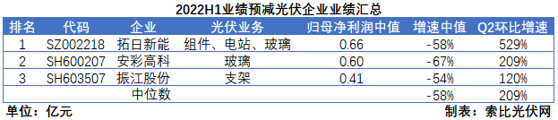業(yè)績預(yù)減企業(yè)中,主要以光伏玻璃和光伏支架企業(yè)為主,業(yè)績降幅中值達到58%。其中,光伏玻璃企業(yè)主要受到去年一季度光伏玻璃價格處于高位的影響。PV Infolink數(shù)據(jù)顯示,2022年上半年2.0鍍膜玻璃平均價格為20.61元/平方米,較去年同期的26.62元/平方米下降23%。不過,從二季度的環(huán)比增速來看,3家企業(yè)的邊際改善較為顯著,中值達到209%,下半年的經(jīng)營業(yè)績有望持續(xù)提升。
