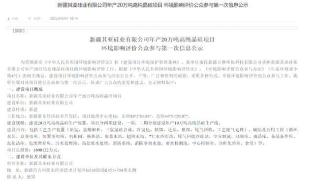根據(jù)該項(xiàng)目此前公示的第一次環(huán)評(píng)顯示,項(xiàng)目建設(shè)單位為其亞鋁業(yè)集團(tuán)子公司新疆其亞鋁電有限公司。工程位于新疆準(zhǔn)東經(jīng)濟(jì)技術(shù)開(kāi)發(fā)區(qū)。建設(shè)規(guī)模為20萬(wàn)噸高純晶硅生產(chǎn)裝置。項(xiàng)目分兩期建設(shè),一期、二期分別建設(shè)年產(chǎn)10萬(wàn)噸高純晶硅生產(chǎn)線。