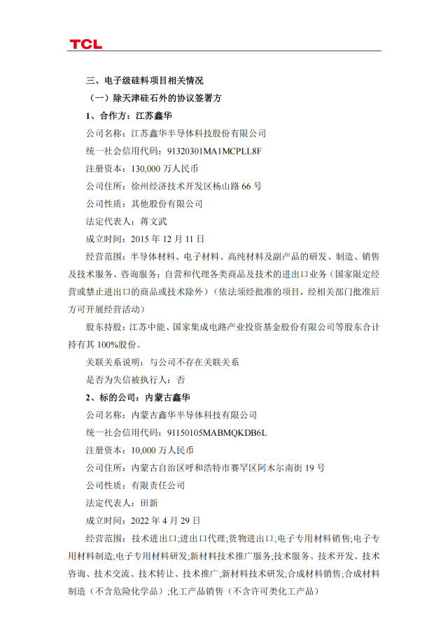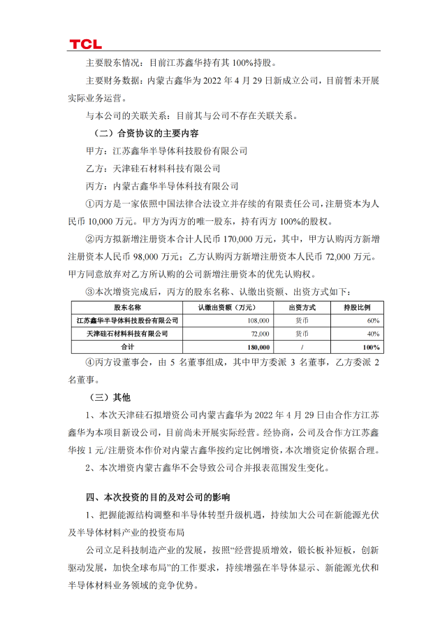 公司與合作方在多晶硅料、單晶拉棒環(huán)節(jié)已開(kāi)展有關(guān)項(xiàng)目的投資合作,通過(guò)本項(xiàng)目將進(jìn)一步鞏固合作關(guān)系,加強(qiáng)上下游資源協(xié)調(diào),為未來(lái)新能源光伏產(chǎn)品的產(chǎn)能爬坡,以及擴(kuò)大產(chǎn)品市場(chǎng)份額打下良好的基礎(chǔ)。與此同時(shí),伴隨國(guó)內(nèi)半導(dǎo)體市場(chǎng)的快速增長(zhǎng),預(yù)計(jì)電子級(jí)多晶硅市場(chǎng)需求將持續(xù)擴(kuò)大,公司與江蘇鑫華在電子級(jí)多晶硅、半導(dǎo)體大硅片等領(lǐng)域長(zhǎng)期合作,通過(guò)本項(xiàng)目將進(jìn)一步增強(qiáng)公司在半導(dǎo)體材料領(lǐng)域的市場(chǎng)地位。