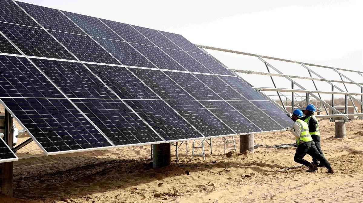 記者在35萬千瓦新增負(fù)荷消納光伏發(fā)電項(xiàng)目建設(shè)現(xiàn)場看到,一排排光伏板連線成片,宛如藍(lán)色的海洋,向戈壁深處不斷延伸,呈現(xiàn)出一派蓬勃發(fā)展的新氣象。項(xiàng)目業(yè)主單位和建設(shè)單位全力組織技術(shù)人員和工人,按照一季度項(xiàng)目施工進(jìn)度計(jì)劃,分片區(qū)、分方陣進(jìn)行光伏支架和光伏組件安裝。目前,110個發(fā)電方陣、67萬塊組件以及相關(guān)設(shè)施的施工正有序進(jìn)行中。