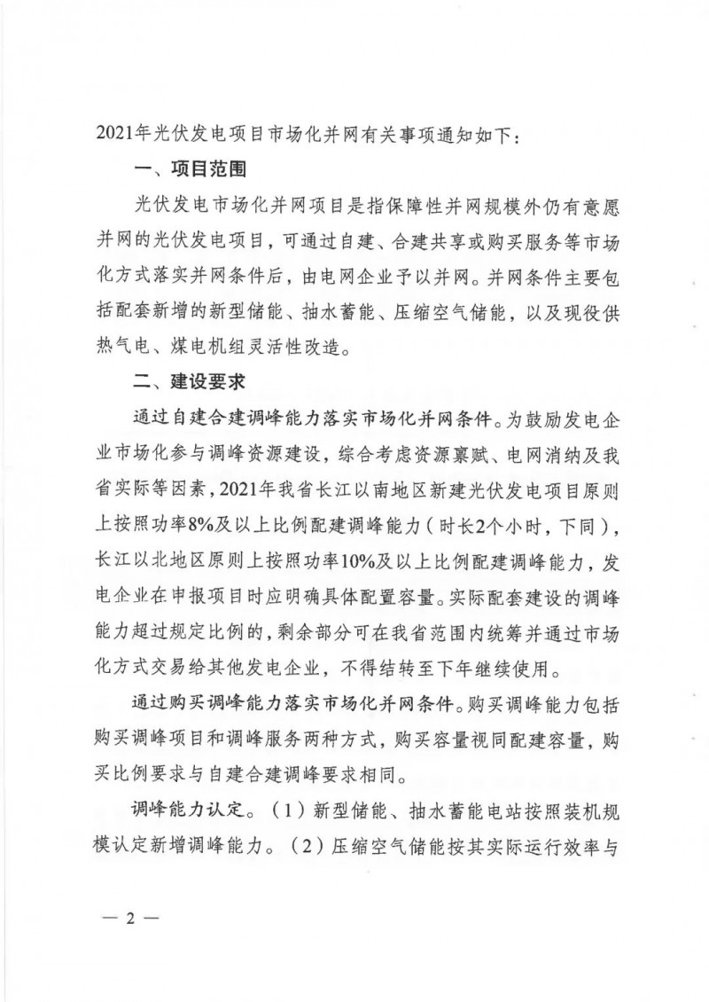 2021年落實(shí)市場(chǎng)化并網(wǎng)條件的光伏發(fā)電項(xiàng)目:原則上應(yīng)在2023年6月底前建成并網(wǎng)。配套新增調(diào)峰能力項(xiàng)目原則上應(yīng)為2021年1月1日以后投產(chǎn)的項(xiàng)目,應(yīng)與光伏發(fā)電項(xiàng)目同步建成、同步并網(wǎng),可在光伏發(fā)電項(xiàng)目所在地建設(shè),也可以異地建設(shè),但長(zhǎng)江以北市場(chǎng)化并網(wǎng)的光伏發(fā)電項(xiàng)目所建設(shè)或購(gòu)買的調(diào)峰能力原則上須在長(zhǎng)江以北區(qū)域建成。