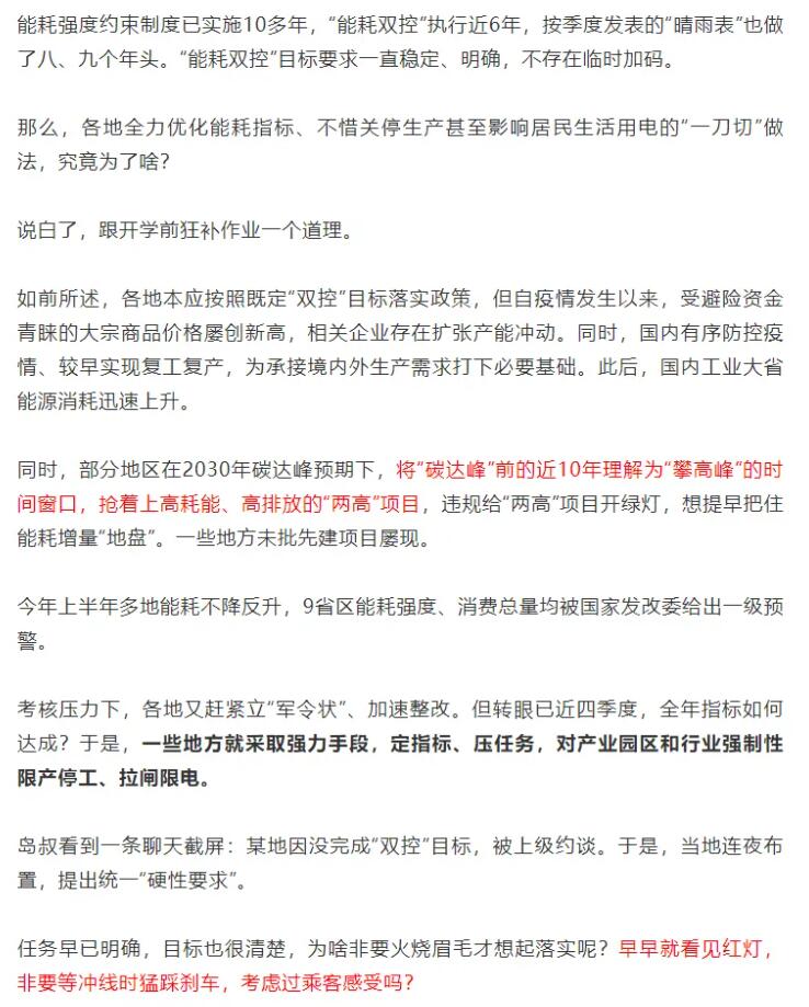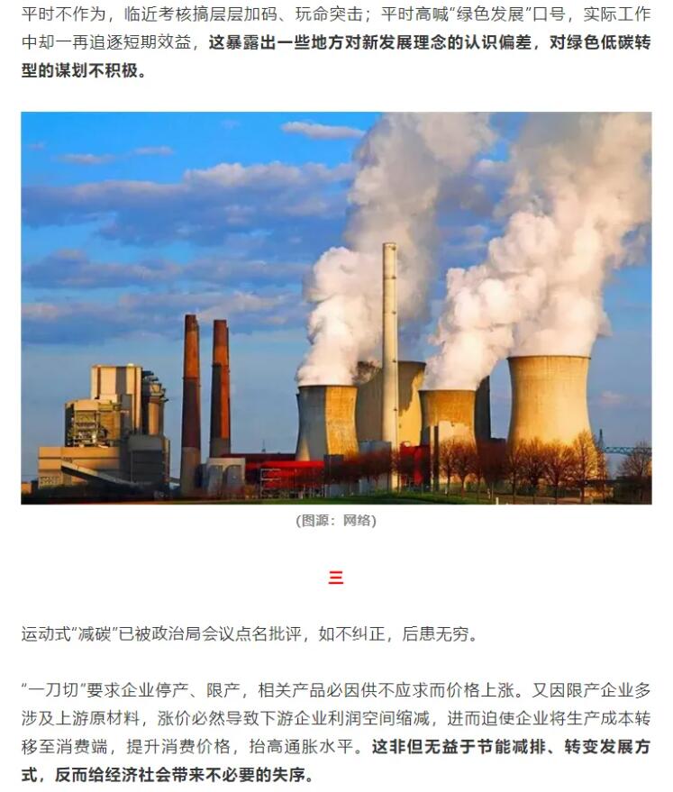 在這一政策的影響下,各地政府層層加碼,許多企業(yè)生產(chǎn)陷入停滯,甚至有部分地區(qū)居民生活用電、用水也受到影響。對此,人民日報海外版《俠客島》評論稱,平時不作為,臨近考核搞層層加碼、玩命突擊;平時高喊“綠色發(fā)展”口號,實際工作中卻一再追逐短期效益,這暴露出一些地方對新發(fā)展理念的認識偏差,對綠色低碳轉(zhuǎn)型的謀劃不積極,“跟開學前狂補作業(yè)一個道理。”