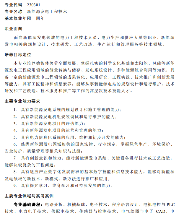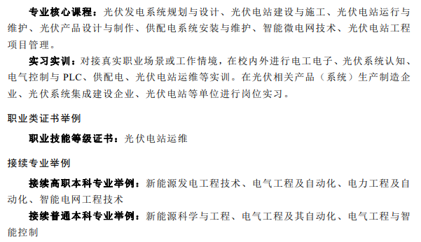 在中等職業(yè)教育、高等職業(yè)教育專科專業(yè)、高等職業(yè)教育本科專業(yè)的簡介中均包含光伏相關專業(yè),都同屬于能源動力與材料大類新能源發(fā)電工程類。