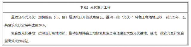 加快整縣(市、區(qū))屋頂光伏開(kāi)發(fā)試點(diǎn)建設(shè),推動(dòng)一批“光伏+”特色工程落地見(jiàn)效,到2025年,公共建筑光伏安裝率達(dá)到20%。