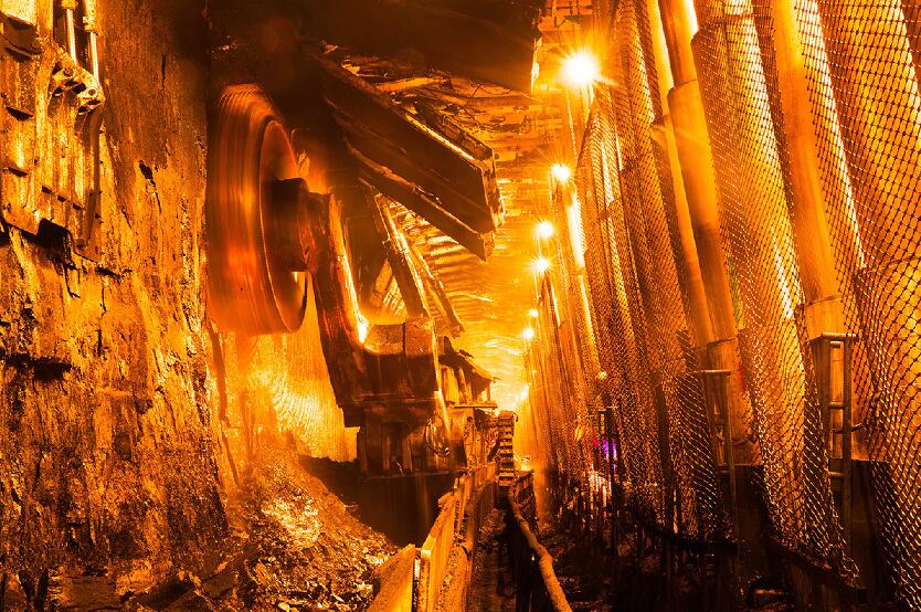 在井道中行駛20多分鐘,就到達了8.8米超大采高智能綜采工作面。只見直徑3.5米的兩只滾筒式采煤刀一前一后、一上一下,在接近3層樓高的煤壁上垂直飛旋,煤刀的刀頭異常鋒利,所到之處煤塊紛紛落下。一刀從機頭割到機尾,就是3000噸煤,這是常規(guī)工作面開采的兩倍。