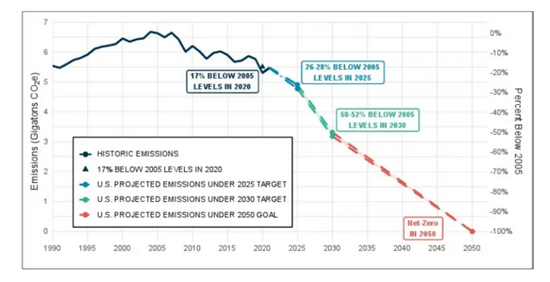 11月1日周一,白宮公布了到 2050 年實(shí)現(xiàn)“凈零”溫室氣體排放的戰(zhàn)略——根據(jù)該戰(zhàn)略,美國將努力消除或抵消所有氣候污染。此前,拜登曾在多次競選活動及上任后的發(fā)言中表示,保證到2030年將美國的溫室氣體排放量相對于2005年的水平減少50-52%,并在2050年之前實(shí)現(xiàn)凈零排放,而這個(gè)目標(biāo)比當(dāng)年奧巴馬政府高了一倍(2025年將排放量減少26-28%)。