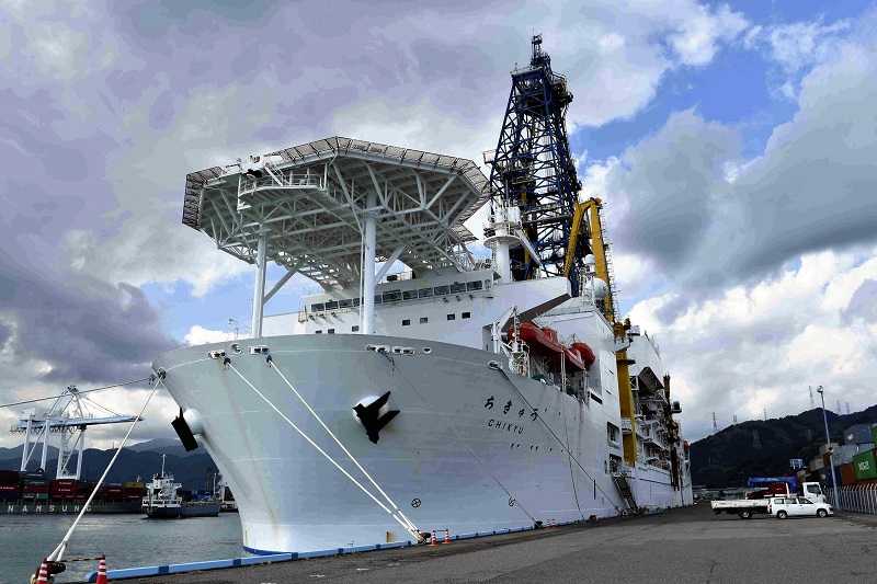 2018年10月,在靜岡清水港的地球深部探測船“地球”號(Chikyu)。 圖片來源:日本時報網(wǎng)站