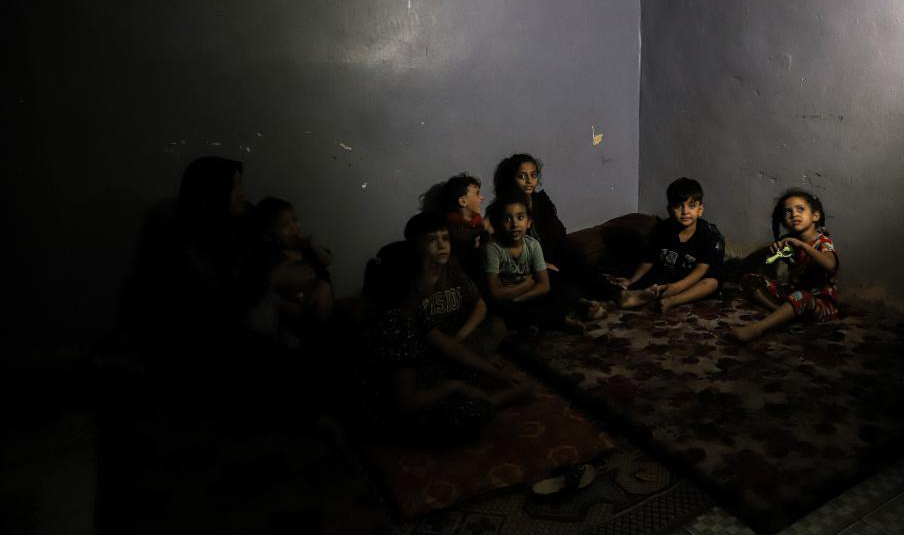 當(dāng)?shù)貢r(shí)間2023年10月16日,加沙地帶的汗尤尼斯,孩子們在黑暗的房間中。
