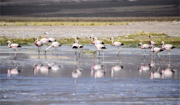 阿根廷一鋰鹽湖附近的火烈鳥(niǎo)。每年夏天,火烈鳥(niǎo)都會(huì)聚集在阿根廷、玻利維亞和智利安第斯山脈的鹽沼和瀉湖中覓食和筑巢。 Ganfeng Lithium 圖