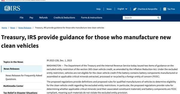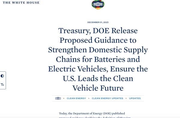 12月1日,美國能源部(DOE)發(fā)布《兩黨基礎設施法》中 “敏感外國實體(Foreign Entity of Concern,F(xiàn)EOC)”的解釋文件。同日,美國財政部(Treasury)和國稅局(IRS)發(fā)布了《通貨膨脹削減法》(IRA)第30D條清潔能源車輛稅收抵免相關禁令的指導意見。