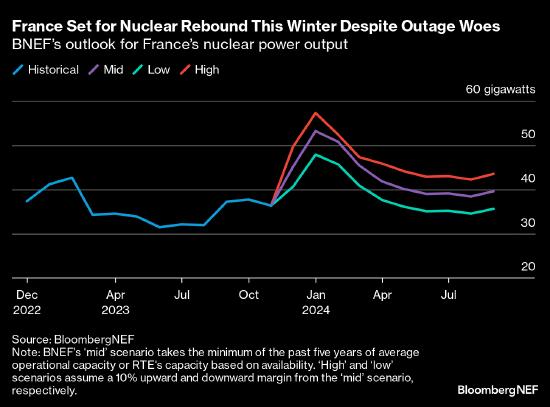 鑒于這些最新進展,彭博新能源財經(jīng)將其對法國12月可用核電裝機容量的預測下調(diào)至45GW,較之前的預測低7%。不過,彭博新能源財經(jīng)仍然預測,法國在即將到來冬季的可用核電裝機容量平均為50GW,比去年同期增長23%。