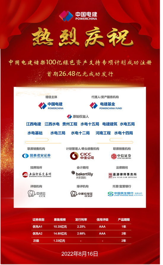 近日,“中國電建2022年第1-10期綠色資產(chǎn)支持專項計劃”取得上海證券交易所批復,綠色儲架規(guī)模達100億元。本項目以電建股份成員單位持有的綠色應收款項為基礎資產(chǎn),由電建股份作為增信機構,電建基金作為代理人統(tǒng)一歸集基礎資產(chǎn)并發(fā)行綠色資產(chǎn)支持證券。一次儲架分次發(fā)行和基金公司代理人模式為電建成員單位提供了壓降“兩金”、降低資產(chǎn)負債率的便捷高效新渠道。
