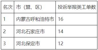 從各市的投訴舉報工單數(shù)量來看,內(nèi)蒙古呼和浩特市最多。數(shù)量前三名的市見表8。