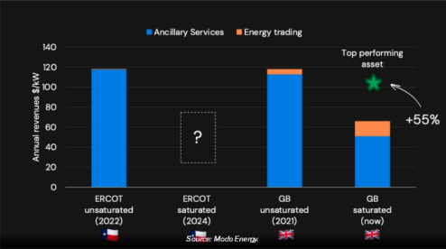 Modo Energy公司的Draper-Scrimshire將德克薩斯州電池儲(chǔ)能市場(chǎng)的發(fā)展與英國(guó)儲(chǔ)能市場(chǎng)進(jìn)行了比較。并指出盡管電池儲(chǔ)能系統(tǒng)裝機(jī)容量不斷增長(zhǎng),獲得的收入與2021年相比有所下降,但表現(xiàn)最好的儲(chǔ)能系統(tǒng)可能會(huì)保持在原來的收入水平。