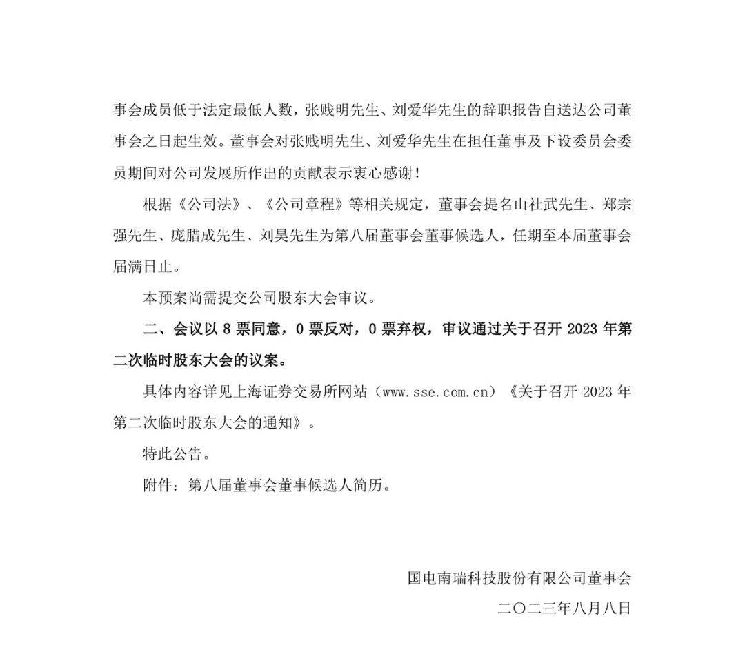 8月8日,國電南瑞科技股份有限公司發(fā)布公告稱,因工作變動,冷俊不再擔任公司第八屆董事會董事長、董事及董事會戰(zhàn)略委員會召集人等職務 ,但目前仍為公司法定代表人。