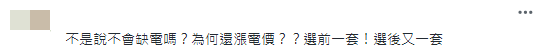 相關(guān)消息也引起島內(nèi)網(wǎng)民吐槽,有網(wǎng)民在臺(tái)媒留言區(qū)批評稱,“不是說不會(huì)缺電嗎?為何還漲電價(jià)?選前一套!選后又一套”。