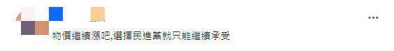 還有島內(nèi)網(wǎng)民評論道,“物價(jià)繼續(xù)漲吧,選擇民進(jìn)黨就只能繼續(xù)承受”。