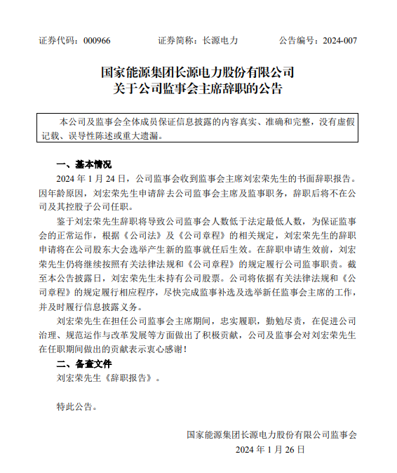1月26日,長源電力發(fā)布公告稱,1月24日,公司監(jiān)事會收到監(jiān)事會主席劉宏榮先生的書面辭職報告。因年齡原因,劉宏榮先生申請辭去公司監(jiān)事會主席及監(jiān)事職務,辭職后將不在公司及其控股子公司任職。