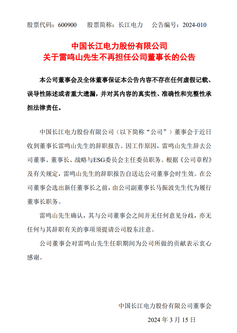 3月15日,長江電力發(fā)布公告稱,公司董事會于近日收到董事長雷鳴山先生的辭職報告。因工作原因,雷鳴山先生辭去公司董事、董事長、戰(zhàn)略與ESG委員會主任委員職務(wù)。