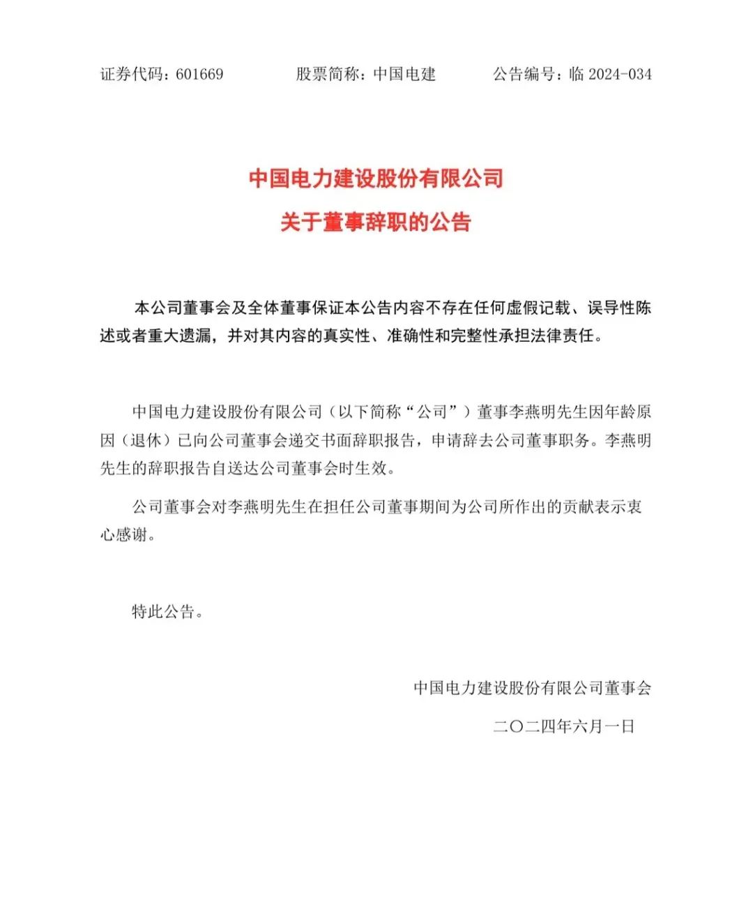 6月1日,中國(guó)電建發(fā)布公告稱,公司董事李燕明先生因年齡原因(退休)已向公司董事會(huì)遞交書面辭職報(bào)告,申請(qǐng)辭去公司董事職務(wù)。李燕明先生的辭職報(bào)告自送達(dá)公司董事會(huì)時(shí)生效。