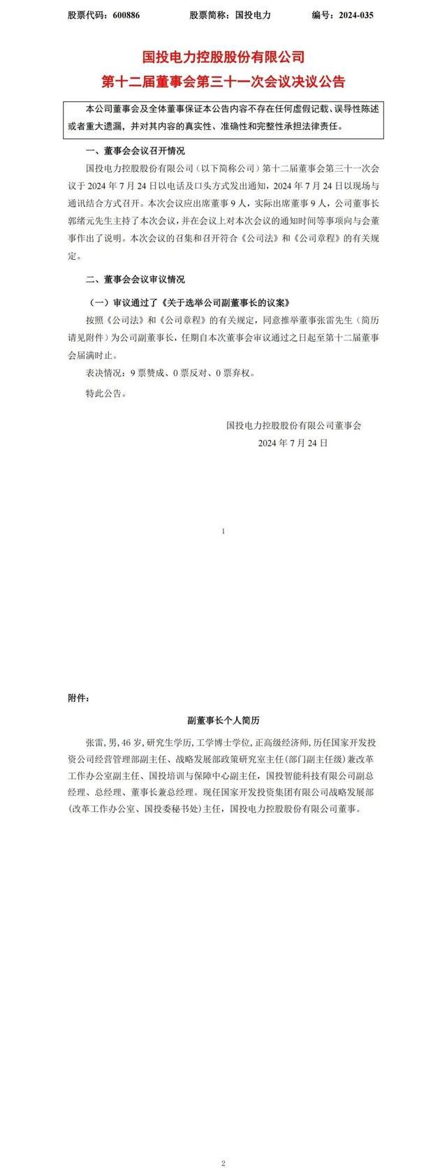 7月24日,國(guó)投電力發(fā)布公告,董事會(huì)審議通過(guò)了《關(guān)于選舉公司副董事長(zhǎng)的議案》,同意推舉董事張雷先生為公司副董事長(zhǎng),任期自本次董事會(huì)審議通過(guò)之日起至第十二屆董事會(huì)屆滿時(shí)止。