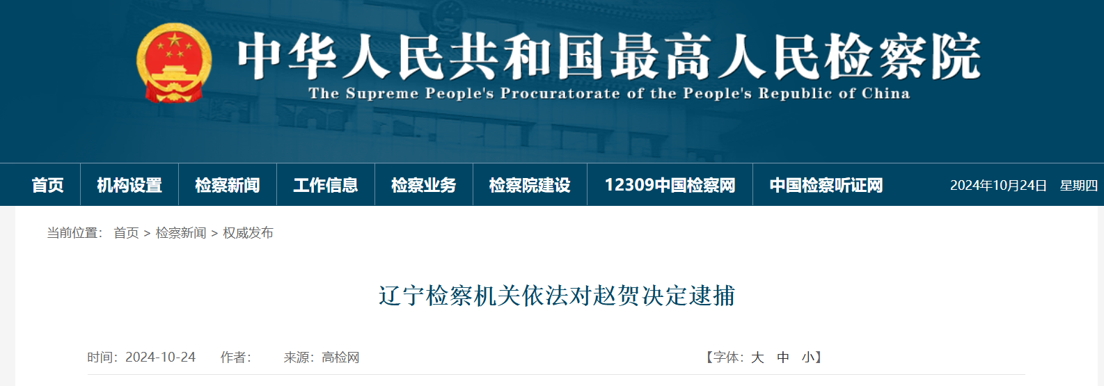 經(jīng)遼寧省人民檢察院指定管轄,由鞍山市人民檢察院審查起訴。日前,鞍山市人民檢察院依法以涉嫌受賄罪對趙賀作出逮捕決定。該案正在進(jìn)一步辦理中。