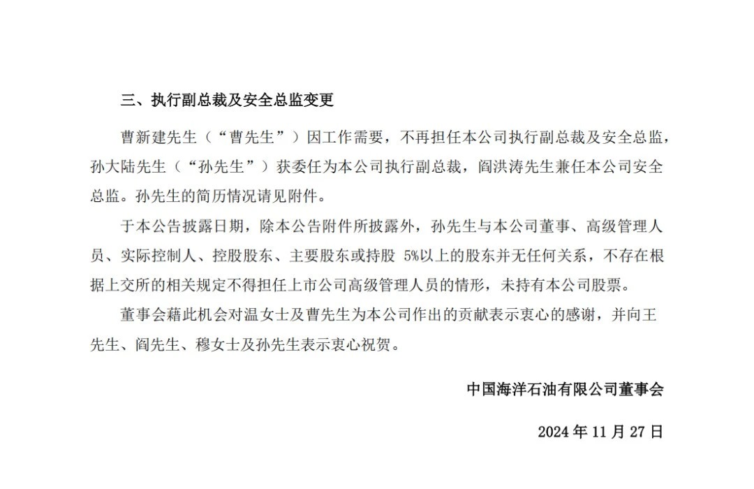 11月27日,中國海洋石油有限公司發(fā)布《關(guān)于董事、高級管理人員變更及調(diào)整董事會下屬委員會組成的公告》: