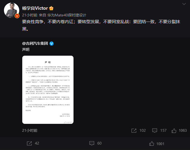 浙江吉利控股集團(tuán)高級(jí)副總裁楊學(xué)良隨后轉(zhuǎn)發(fā)了該聲明,并表達(dá)了個(gè)人觀點(diǎn),表示:要良性競爭,不要內(nèi)卷內(nèi)訌;要轉(zhuǎn)型發(fā)展,不要同室亂戰(zhàn);要團(tuán)結(jié)一致,不要分裂抹黑。