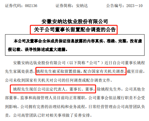 公告指出,姚程先生現(xiàn)任公司法定代表人、董事長、董事,除姚程先生外,公司其他全部董事、監(jiān)事和高級管理人員目前均正常履職,公司董事會依法履行職責(zé)不會受到影響。公司擁有完善的治理結(jié)構(gòu)和業(yè)務(wù)流程,日常經(jīng)營管理由公司高管團(tuán)隊(duì)負(fù)責(zé),公司高管團(tuán)隊(duì)已針對相關(guān)事項(xiàng)做了妥善安排。
