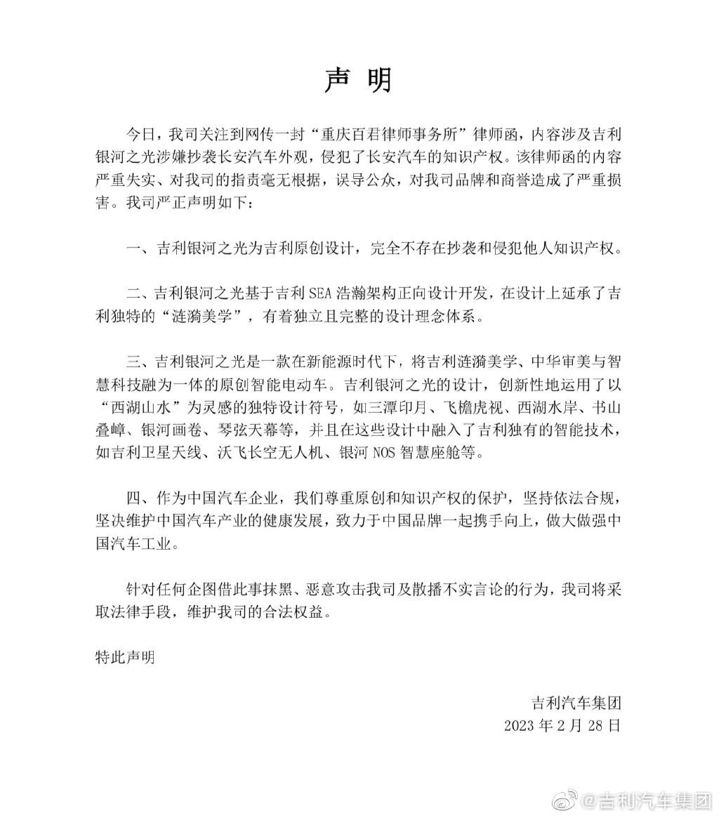 針對(duì)抄襲傳聞,吉利汽車直斥上述律師函“內(nèi)容嚴(yán)重失實(shí)、指責(zé)毫無(wú)根據(jù),誤導(dǎo)公眾,對(duì)我司品牌和商譽(yù)造成了嚴(yán)重?fù)p害。”根據(jù)吉利汽車2月28日發(fā)布的聲明,吉利銀河之光為吉利原創(chuàng)設(shè)計(jì),完全不存在抄襲和侵犯他人知識(shí)產(chǎn)權(quán)。