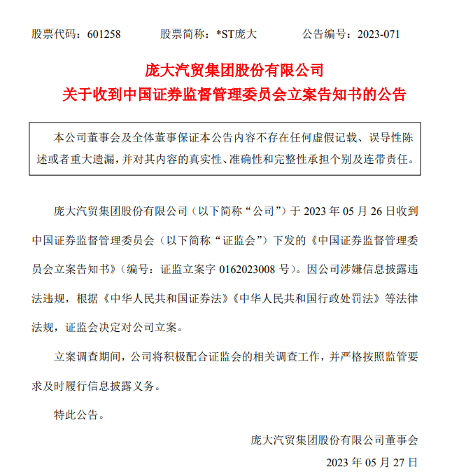 5月26日,*ST龐大再發(fā)公告稱,公司于5月26日收到中國證券監(jiān)督管理委員會(huì)(以下簡稱證監(jiān)會(huì))下發(fā)的《中國證券監(jiān)督管理委員會(huì)立案告知書》。因公司涉嫌信息披露違法違規(guī),根據(jù)相關(guān)法律法規(guī),證監(jiān)會(huì)決定對(duì)公司立案。立案調(diào)查期間,公司將積極配合證監(jiān)會(huì)的相關(guān)調(diào)查工作,并嚴(yán)格按照監(jiān)管要求及時(shí)履行信息披露義務(wù)。