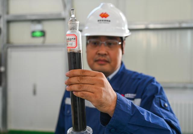 7月7日,國能準(zhǔn)能集團煤基納米碳氫燃料車間主任甄鵬在展示該燃料的樣品。