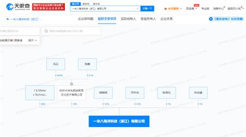 股權(quán)全景穿透圖顯示,該公司由1.8Meters Technology Holding Limited、杭州大井頭貳拾貳號文化藝術(shù)有限公司以及胡曉明等4名自然人共同持股。其中,杭州大井頭貳拾貳號文化藝術(shù)有限公司由馬云持股99.9%;持有一米八海洋科技5.5%股權(quán)并擔任董事長的胡曉明則曾任螞蟻集團CEO。