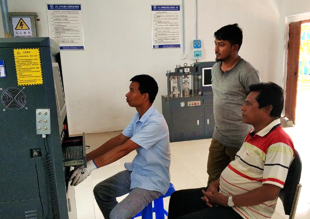 項(xiàng)目試驗(yàn)室建設(shè)引進(jìn)了國內(nèi)項(xiàng)目比較常用的萬能試驗(yàn)機(jī)、壓力試驗(yàn)機(jī)、水泥抗壓抗折一體機(jī)、電動擊實(shí)儀、EV2試驗(yàn)儀、洛氏硬度計、扭矩試驗(yàn)儀、螺栓抗滑試驗(yàn)儀等40臺套主要試驗(yàn)儀器,多數(shù)是由電腦控制,屬于先進(jìn)設(shè)備。此后,項(xiàng)目試驗(yàn)室主任陳立根成了大家的“中國師傅”,帶領(lǐng)16名孟籍試驗(yàn)員一起學(xué)習(xí)研究業(yè)主招標(biāo)文件和技術(shù)規(guī)格書,手把手教授使用各種試驗(yàn)儀器設(shè)備,帶領(lǐng)大家一起開展路基填料、混凝土配比試拌、鋼筋試驗(yàn)等。“他毫無保留地把自己掌握的試驗(yàn)操作規(guī)程都教給了我們。”然森很慶幸自己擁有這樣一位“中國師傅”。