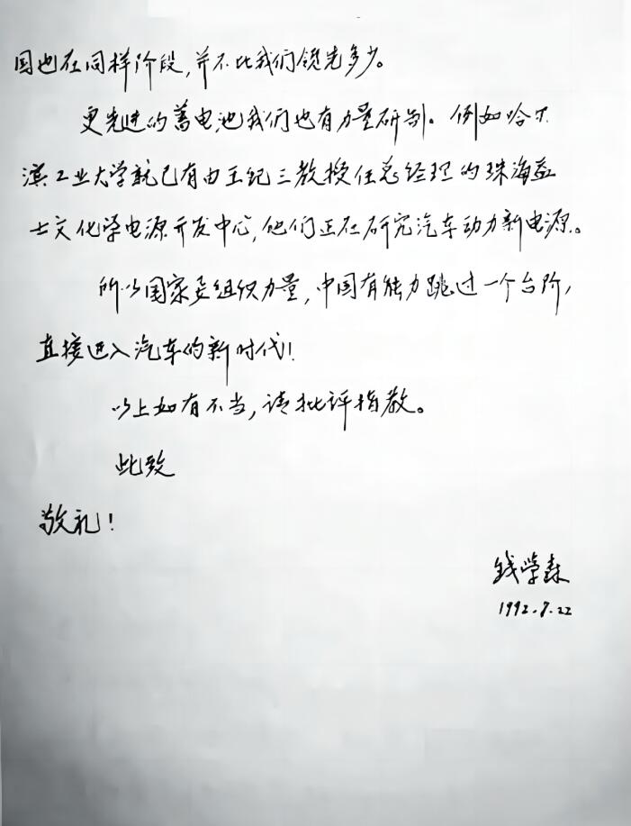 1992年,當(dāng)時已81歲高齡的錢學(xué)森寫信給時任副總理鄒家華,提出了一個高瞻遠(yuǎn)矚的建議:“我國汽車工業(yè)應(yīng)跳過用汽油柴油階段,直接進(jìn)入減少環(huán)境污染的新能源階段……到下個世紀(jì)20年代保護(hù)環(huán)境將是十分重要問題?,F(xiàn)在美國、日本、西歐都在組織各自技術(shù)力量攻高效蓄電池,計劃開發(fā)出蓄電池汽車。”