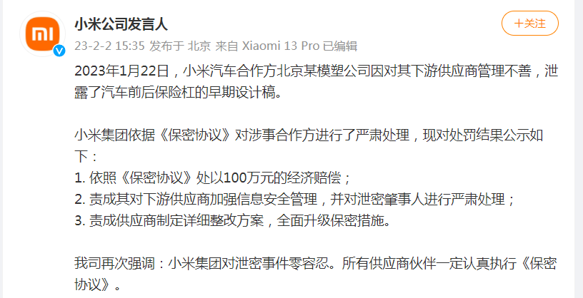 《聲明》稱,2023年12月17日,媒體“ZAKER”員工包某某、“小白買車”員工關(guān)某某,在簽署《保密承諾書》、明知保密義務(wù)與相應(yīng)罰則的情況下,未經(jīng)許可有意泄露保密拍攝內(nèi)容。經(jīng)小米集團(tuán)保密管理團(tuán)隊查實,以上兩人已承認(rèn)其違反保密義務(wù)的行為。經(jīng)與其所屬媒體溝通,小米集團(tuán)將依據(jù)雙方簽署的《保密承諾書》相應(yīng)條款追究兩人及所屬媒體泄密責(zé)任,包括并不限于公開道歉、罰金。另外,《聲明》介紹,2023年11月和12月,小米汽車部三名前員工于在職期間,以收取“咨詢費用”為目的,未經(jīng)許可擅自參與外部券商、投資機構(gòu)組織的所謂“小米汽車研討會”,臆造傳播大量錯誤、不實信息,嚴(yán)重誤導(dǎo)市場、擾亂小米汽車正常業(yè)務(wù)開展。以上三名員工,即于某某(前電控系統(tǒng)與軟件團(tuán)隊員工)、施某(前沖鑄工藝團(tuán)隊員工)、張某(前量產(chǎn)質(zhì)量團(tuán)隊員工),嚴(yán)重違背《小米集團(tuán)員工行為準(zhǔn)則》及公司規(guī)定的保密義務(wù),小米集團(tuán)已對其做辭退處理、永不錄用,并依法追究法律責(zé)任。同時,小米集團(tuán)表示,對組織相關(guān)活動的券商、投資機會,保留追究法律責(zé)任的權(quán)利。小米汽車始終吸引市場高度關(guān)注,這也不是小米集團(tuán)第一次遭遇汽車泄密。今年1月22日,小米汽車合作方北京某模塑科技有限公司因?qū)ζ湎掠喂?yīng)商管理不善,泄露了小米汽車前后保險杠的早期設(shè)計稿。“小米公司發(fā)言人”微博今年2月更新了該泄密事件的處理結(jié)果:小米集團(tuán)表示,已依據(jù)《保密協(xié)議》對涉事合作方進(jìn)行了嚴(yán)肅處理,包括依照《保密協(xié)議》處以100萬元的經(jīng)濟(jì)賠償;責(zé)成其對下游供應(yīng)商加強信息安全管理,并對泄密肇事人進(jìn)行嚴(yán)肅處理;責(zé)成供應(yīng)商制定詳細(xì)整改方案,全面升級保密措施。