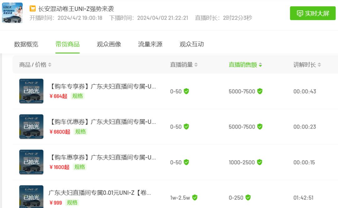 廣東夫婦長安汽車帶貨專場的所有商品均為“購車優(yōu)惠券”,同樣為長安汽車站臺的瘋狂小楊哥帶貨商品也以購車權(quán)益和購車抵扣券為主,后者價格也極其低廉均為0.01元,主打一個“交個朋友”。