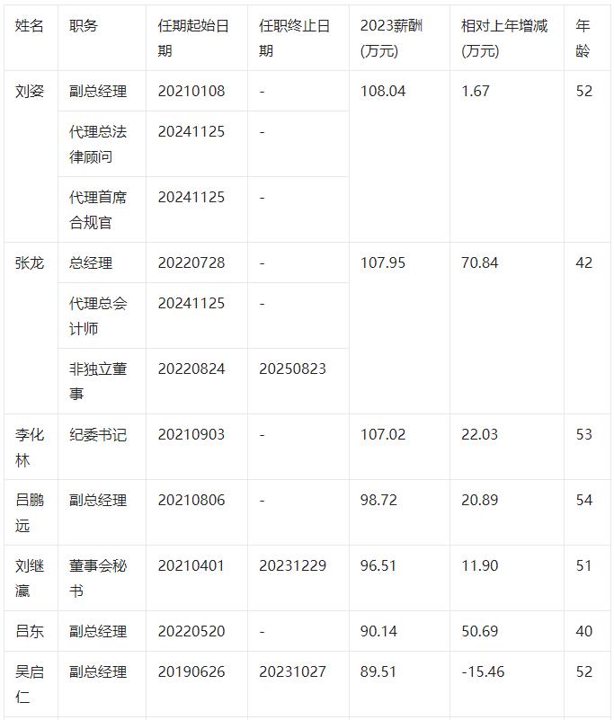 根據(jù)2023年報數(shù)據(jù),剔除獨立董事、監(jiān)事會主席、監(jiān)事后,三峽能源共有13位董事和高級管理人員。從年齡看,三峽能源董事和高級管理人員平均年齡為50.23歲,年齡中位數(shù)為52歲,其中,非獨立董事蔡庸忠年齡最高為62歲,副總經(jīng)理呂東年齡最小為40歲。從薪酬看,董事和高級管理人員合計領(lǐng)取報酬904.35萬元,平均薪酬86.18萬元,年薪中位數(shù)為98.72萬元。其中,副總經(jīng)理、代理總法律顧問及代理首席合規(guī)官劉姿薪酬最高為108.04萬元,非獨立董事蔡庸忠薪酬最低為6.00萬元(2023年任期不滿1年的不參與統(tǒng)計)。