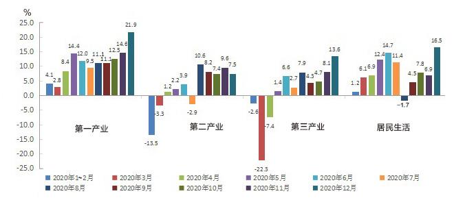 2020年,第一、二、三產(chǎn)業(yè)和居民生活用電量增速分別為10.7%、1.9%、1.4%、6.2%。其中,第一產(chǎn)業(yè)和居民生活用電量增速較上年分別上升5.0、1.5個百分點(diǎn),第二、第三產(chǎn)業(yè)用電增速較上年分別下降0.5、7.5個百分點(diǎn)。第二產(chǎn)業(yè)用電量基本恢復(fù)常態(tài)化增長,第三產(chǎn)業(yè)用電量增長態(tài)勢較正常水平仍有較大差距。12月份,第一、二、三產(chǎn)業(yè)和居民生活用電量增速分別為21.9%、7.5%、13.6%、16.5%,第二產(chǎn)業(yè)用電量增速持續(xù)維持高位;第三產(chǎn)業(yè)用電量年內(nèi)首現(xiàn)兩位數(shù)增長,恢復(fù)態(tài)勢強(qiáng)勁;居民生活用電量受低溫寒潮天氣影響,增速創(chuàng)年內(nèi)新高。