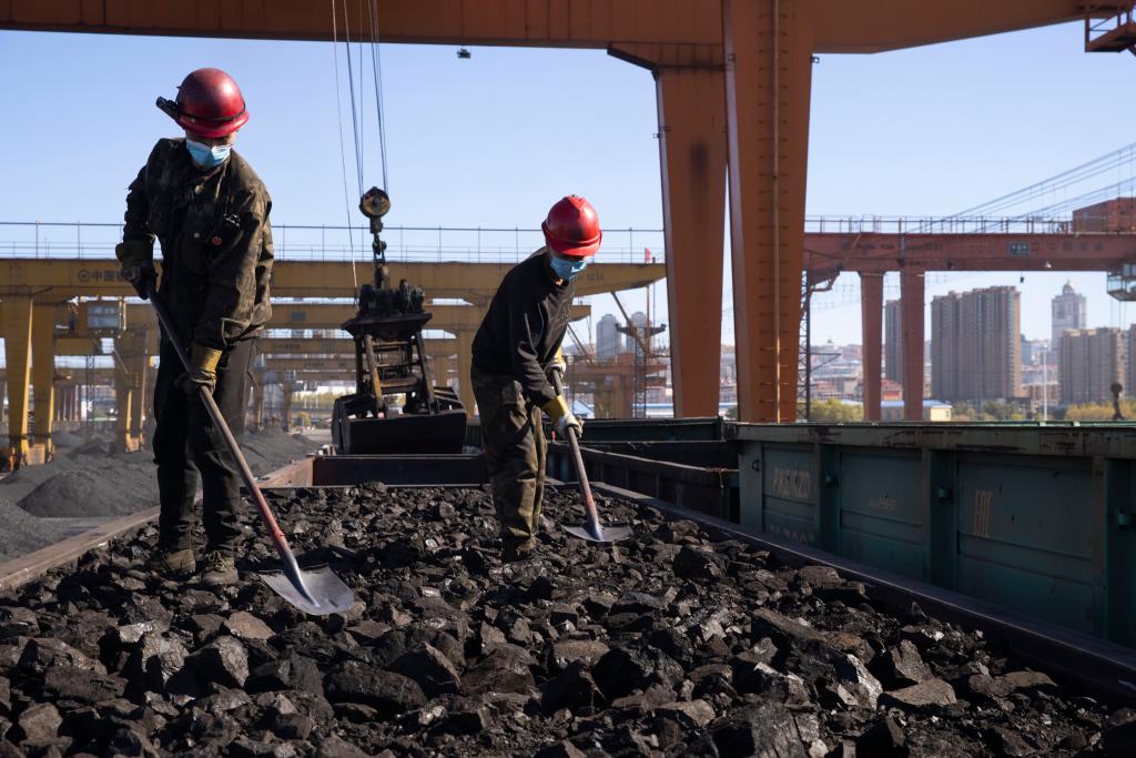 10月12日,在綏芬河鐵路口岸換裝現(xiàn)場,工人進(jìn)行煤炭平整作業(yè)。新華社記者 張濤 攝