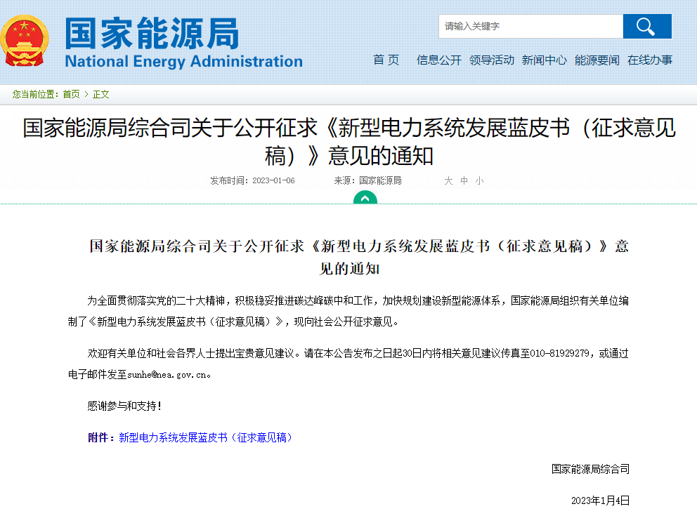 國家能源局綜合司關(guān)于公開征求《新型電力系統(tǒng)發(fā)展藍(lán)皮書(征求意見稿)》意見的通知