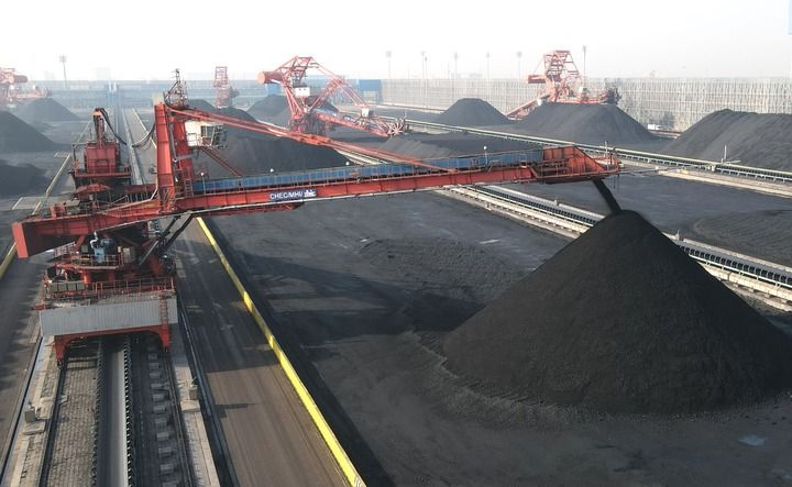 河北黃驊港煤炭堆場(chǎng)轉(zhuǎn)運(yùn)設(shè)備在作業(yè)(2023年1月8日攝,無(wú)人機(jī)照片)。