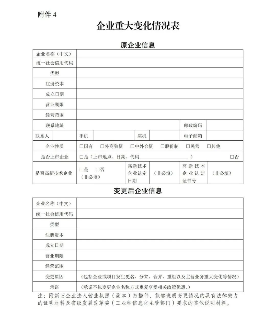 五、已享受《若干政策》第(一)、(三)、(六)、(七)條,以及財(cái)關(guān)稅〔2021〕4號(hào)文提及的關(guān)稅優(yōu)惠政策的企業(yè)或項(xiàng)目發(fā)生更名、分立、合并、重組以及主營業(yè)務(wù)重大變化等情況,應(yīng)及時(shí)向地方發(fā)改和工信部門報(bào)告,并于完成變更登記之日起60日內(nèi),將企業(yè)重大變化情況表和相關(guān)材料報(bào)送國家發(fā)展改革委、工業(yè)和信息化部(以省級(jí)部門上報(bào)文件落款日為準(zhǔn))。國家發(fā)展改革委、工業(yè)和信息化部會(huì)同相關(guān)部門確定發(fā)生變更情形后是否繼續(xù)符合享受優(yōu)惠政策的企業(yè)條件或項(xiàng)目標(biāo)準(zhǔn)。