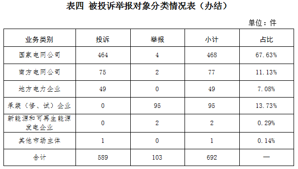 從被投訴舉報對象看,供電企業(yè)594件、占投訴舉報總數(shù)的85.84%,其中國家電網(wǎng)公司468件、占比67.63%,南方電網(wǎng)公司77件、占比11.13%,地方電力企業(yè)49件、占比7.08%;承裝(修、試)電力設(shè)施施工企業(yè)95件、占比13.73%;新能源和可再生能源發(fā)電企業(yè)2件、占比0.29%;其他市場主體1件、占比0.14%。